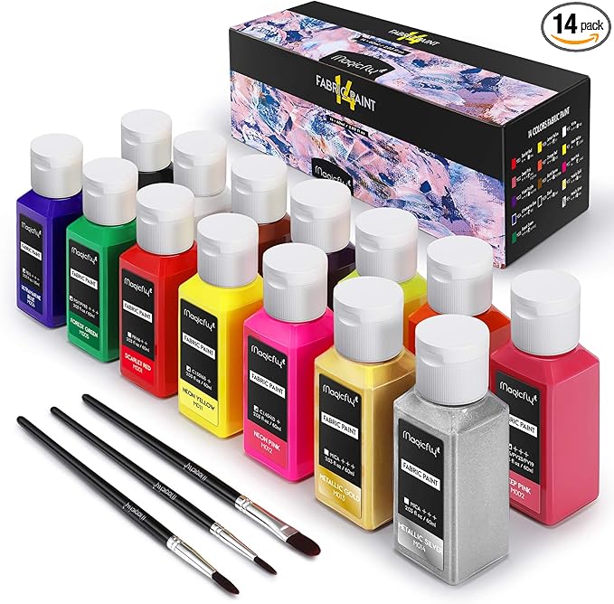 With this set you get a whopping 14 colors with 60ml (~2oz) in each bottle. There are 10 regular colors, 2 neons (yellow and pink), and to metallic colors (silver and gold). They also throw in 3 paintbrushes so you don’t need to get those separately, which is a nice touch.