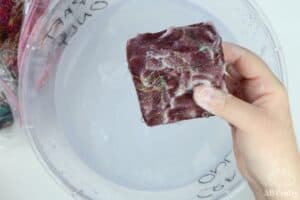 Wrap the bar in mesh fabric, dip in the hot water, and rub gently. Gradually increase the friction until the wool is completely felted.